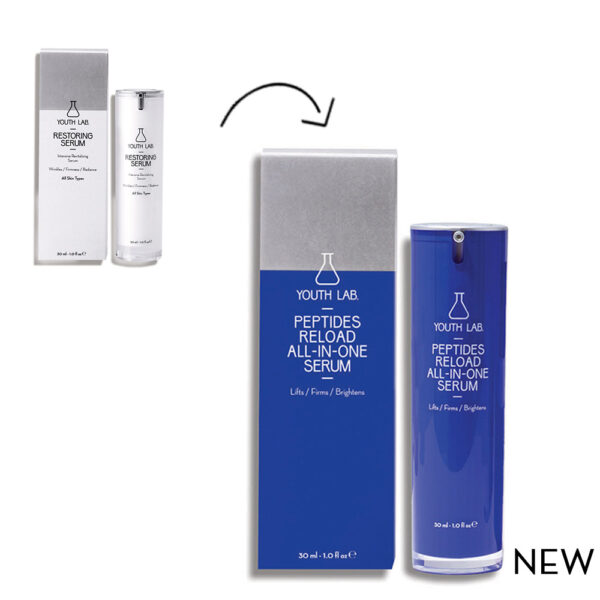 Het Restoring Serum verandert van naam… en uiterlijk, met behoud van dezelfde effectieve samenstelling! Peptides Reload All-In-Serum is een intensief herstellend serum met antirimpel- en verstevigende werking, dat de helderheid van de huid verbetert en tegelijkertijd de stevigheid en glans van de huid herstelt.